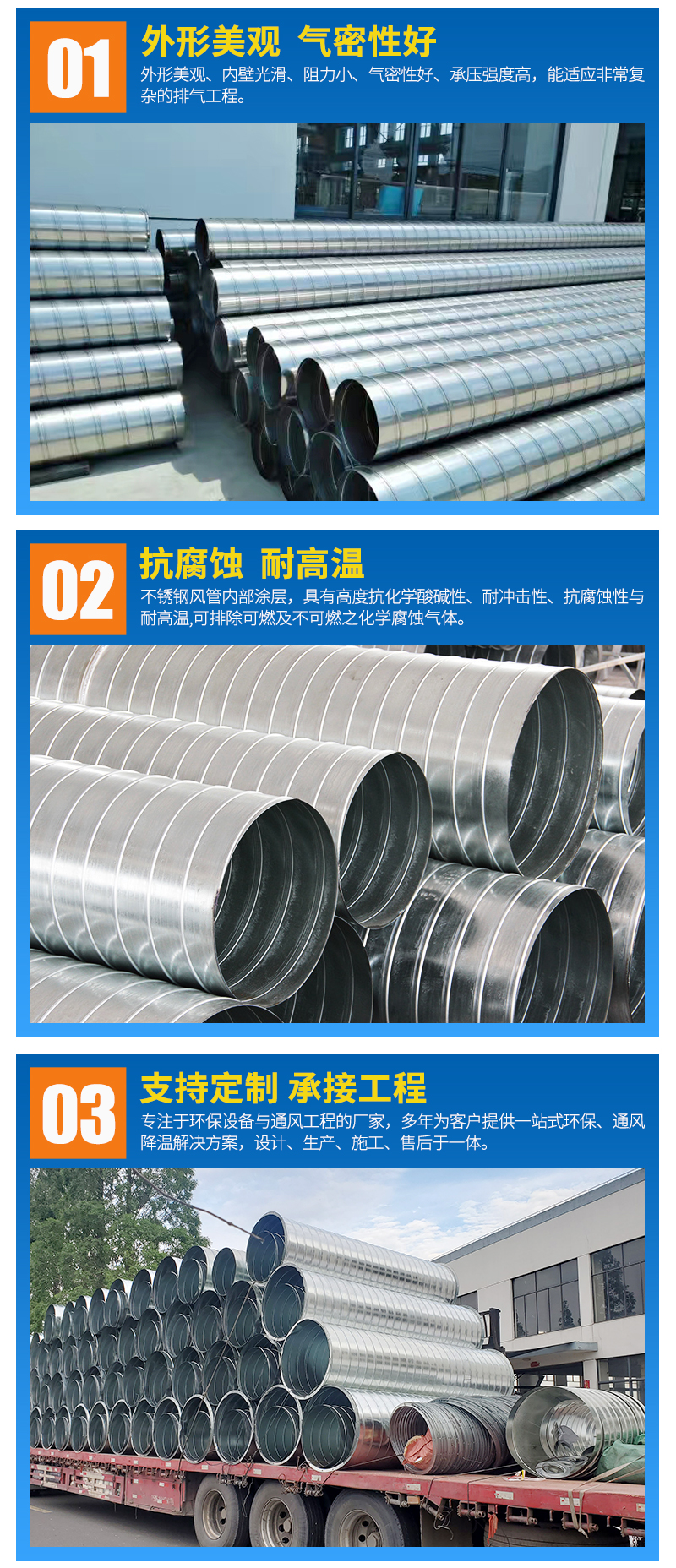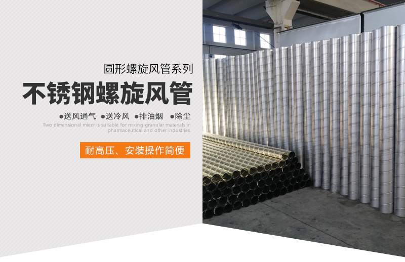 1.送風(fēng),包括通氣。如送鮮風(fēng)和排氣,這個(gè)范圍很廣,如工廠車間,生產(chǎn)場(chǎng)地空氣,由于有害氣體產(chǎn)生需要排出室外,又需要把室外空氣輸送至室內(nèi),這時(shí)就要使用流量大而壓力小的空氣輸送管道,螺旋風(fēng)管就是最適用,一般情況下使用鍍鋅鐵管,有腐蝕性及特別潮濕場(chǎng)所使用不銹鋼管。