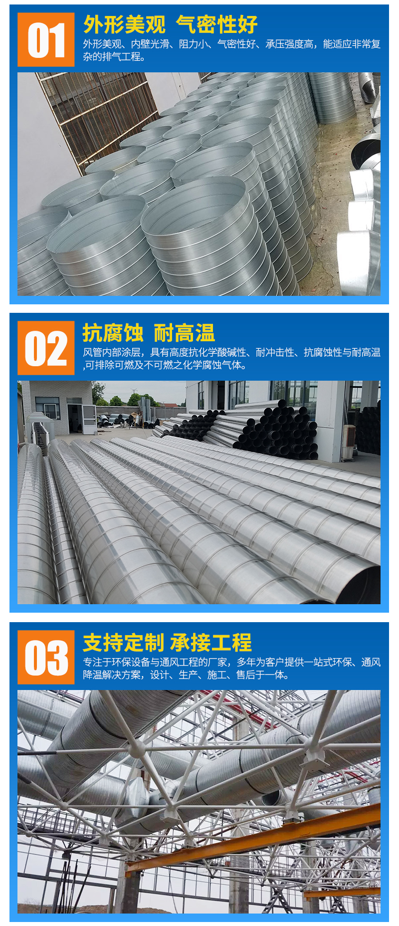 1.送風(fēng),包括通氣。如送鮮風(fēng)和排氣,這個(gè)范圍很廣,如工廠車間,生產(chǎn)場(chǎng)地空氣,由于有害氣體產(chǎn)生需要排出室外,又需要把室外空氣輸送至室內(nèi),這時(shí)就要使用流量大而壓力小的空氣輸送管道,螺旋風(fēng)管就是最適用,一般情況下使用鍍鋅鐵管,有腐蝕性及特別潮濕場(chǎng)所使用不銹鋼管。